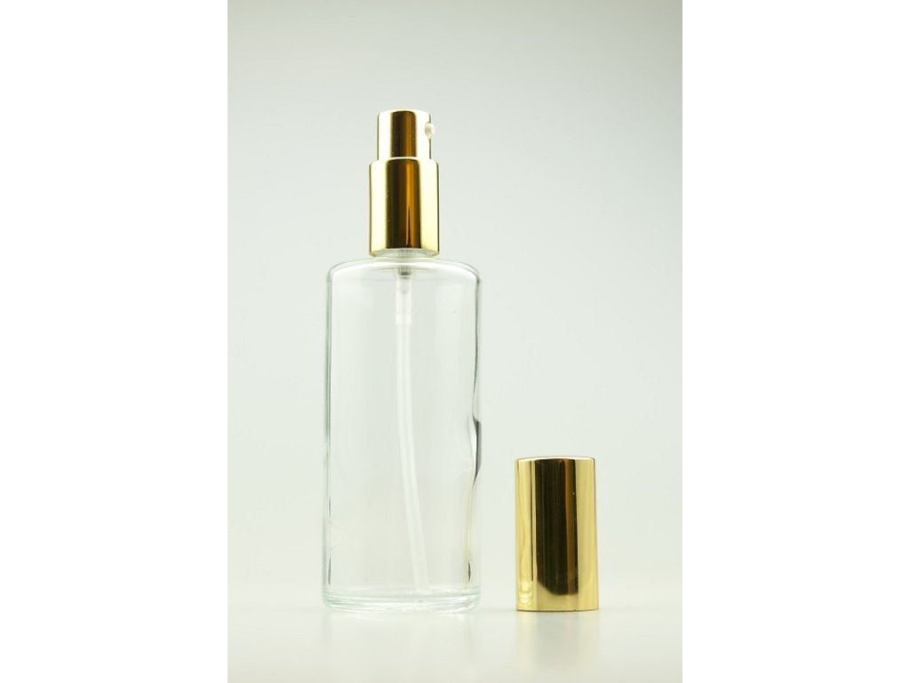 Skleněný 100ml flakón, s kovovou dávkovací pumpičkou, aluminiové víčko . Barva zlatá. Vhodné pro gely, séra, oleje, mléka.